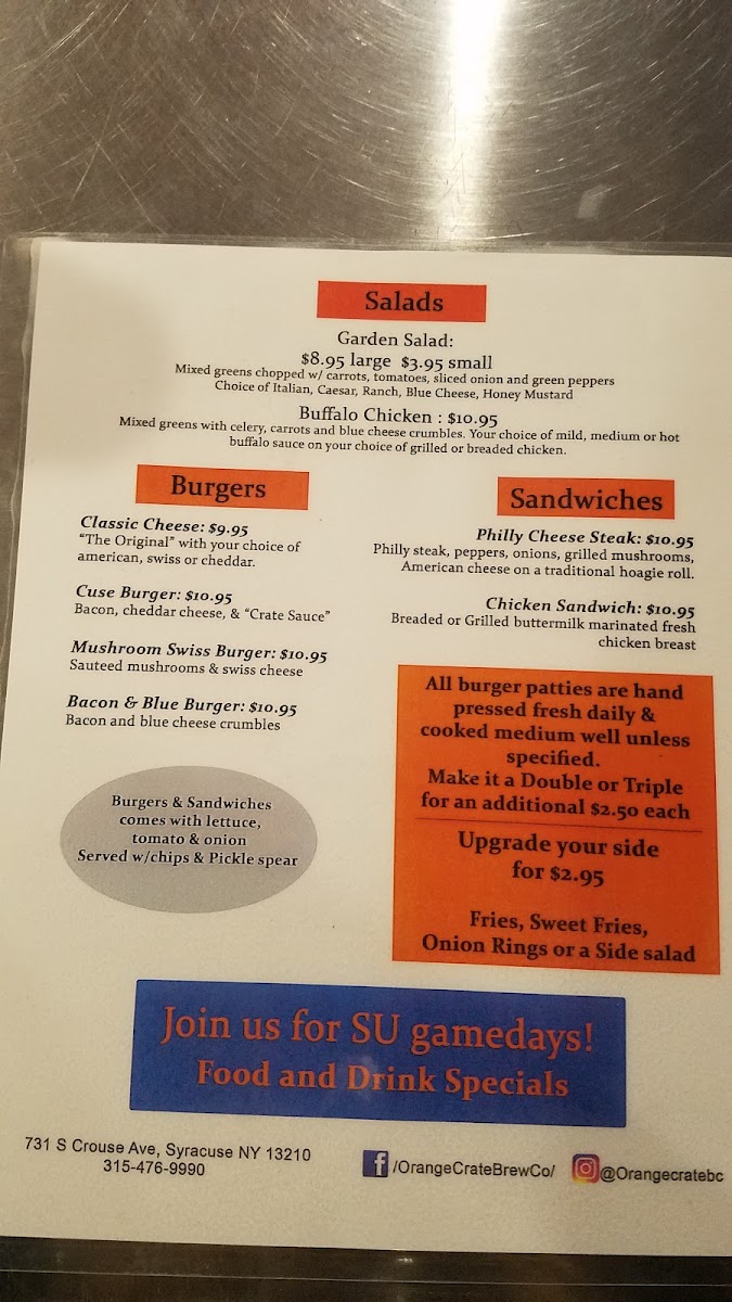 Welcome to Orange Crate Brewing Company, located at 731 S Crouse Ave, Syracuse, NY. Known for its vibrant atmosphere, this gem is a game-day haven where fans gather to savor delicious bites and toast with cold drinks.